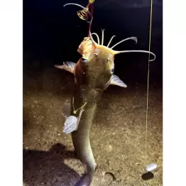突然、リールから糸が吐き出された。穂先がビクンビクンと激しく脈打つ。慌てて竿を引っ掴んでドラグを締める。想像以上の引き。しばしの格闘の末、40センチほどのアメリカナマズが顔をのぞかせた。たしかに見た目はグロテスク。サイズ的にはやや物足りないが、これだけの手応えだ。大型はもっとすごいに違いない。俄然、気合が入る。