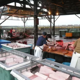 魚に似た巨大な動物が、暗闇の海からロープに引かれて姿を現すと、「おー」「デカい」などと一斉に歓声が上がった。水産庁から出向している検査官が、体長を測り身肉のサンプルをそぎ取る。やがて作業員が大きな長刀のような包丁で皮を切っていく。動力のワイヤが、その皮をメリメリと引っ張り剥がすのだ。