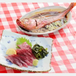 魚を買って隣の食堂で待てば、料理されて運ばれるのだ。ならば地元でアカサバと呼ぶ、ハチビキを食べてみたい。40センチはあろう1匹が1900円。半身を刺し身に、半身は煮つけてもらおう。