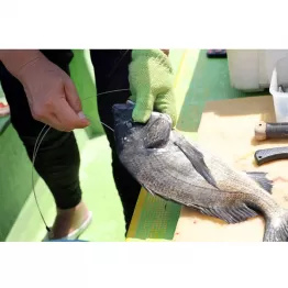 上田さんは放血させている間に竿を持ち直し、1匹釣っている。その1匹を生かす用のバケツに放したところで、血抜きした1匹を取り上げて血抜き完了を確認すると、ワイヤを取り出した。神経締めだ。