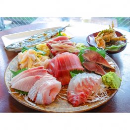 店の黒板には、その日のオススメや定番メニューがぎっしり並ぶ中、マストで注文したいのが旬の刺し身だ。今回注文したのは、皿の奥のカツオ(430円)から時計回りに締めサバ(390円)、黒タイ(390円)、カンパチ(530円)、活ツブ貝(530円)と並び、中央に本マグロのトロをそれぞれ1人前ずつ盛り合わせていただいた。