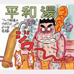 西武新宿線鷺ノ宮駅北口から鷺宮図書館の前を通り越えて歩くこと7分ほど。新青梅街道沿いの「平和湯」は創業73年の老舗銭湯。下足場の木札を手にフロントに座る4代目・橋本龍三さんに入浴料+サウナ代950円を支払い、タオルセットとワッフル生地のマット、サ室フックキーを受け取ります。キーはピーターパンの宿敵フック船長のカギ爪みたいな珍しい形ですよ。
