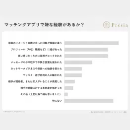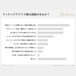 株式会社Presiaの調査によると、マッチングアプリ経験者158名のうち82.3%が『嫌な経験あり』と回答。中でも多かったのが「写真詐欺」、「プロフィールの虚偽」「突然ブロック」なのだそう。