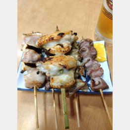 つまみは炭火で焼いた焼き鳥。とり盛り5本セット(860円)をもらう。手羽先、モモネギマ、砂肝、レバー、皮の5種類。もちろん塩で。熱々の手羽先をかじり、生ビールを流し込む。サイコ~。夜の料金になる前に中生をおかわりし、次は焼きトンのもつ盛り5本セット(790円)を焼いてもらう。こっちはカシラ、シロ、タン、ハツ、ナンコツだ。食い過ぎかなと思ったが、昼飯代わりだからいいか。
