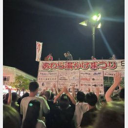 だが、例外もある。年に一度の「湯かけ祭り」は、駅前の広場であわら温泉の湯をぶっかけまくるというワイルドな行事だ。そしてその翌日の夜には、櫓から饅頭を撒くのがお決まりである。節分の豆撒きみたいなものだ。