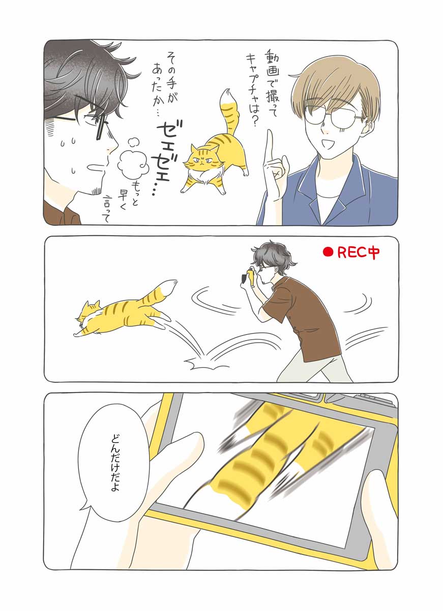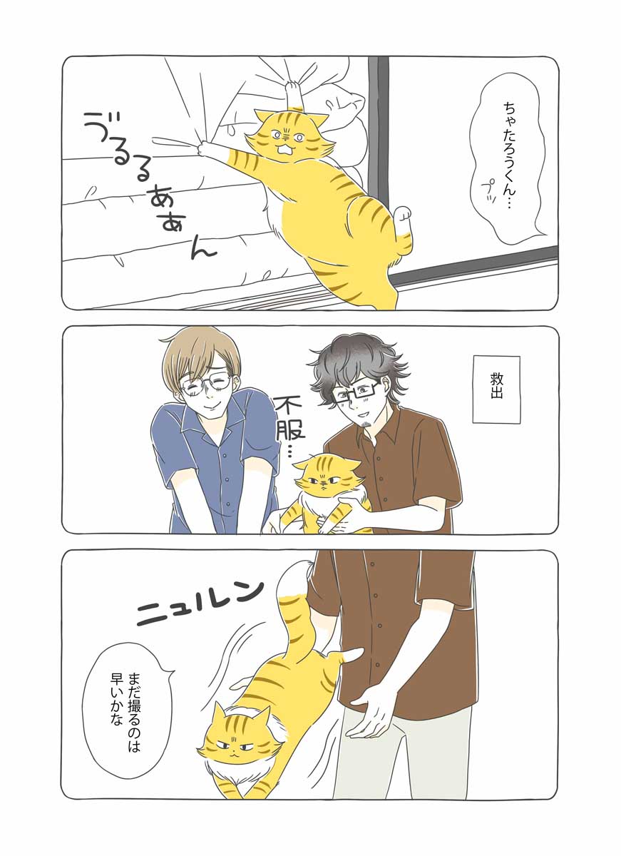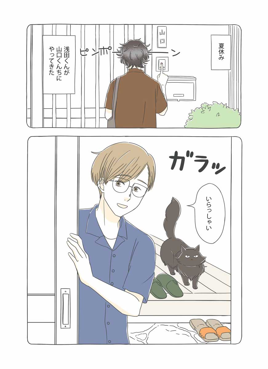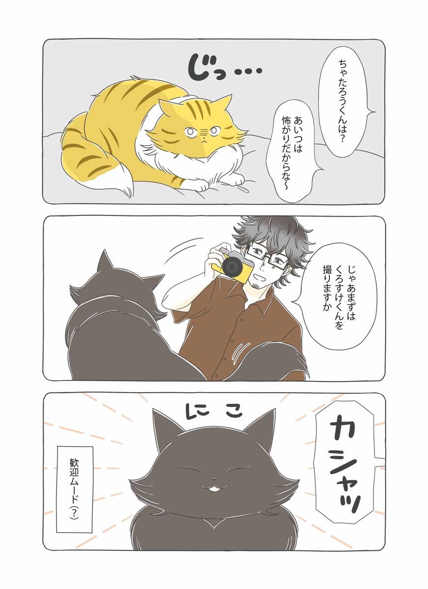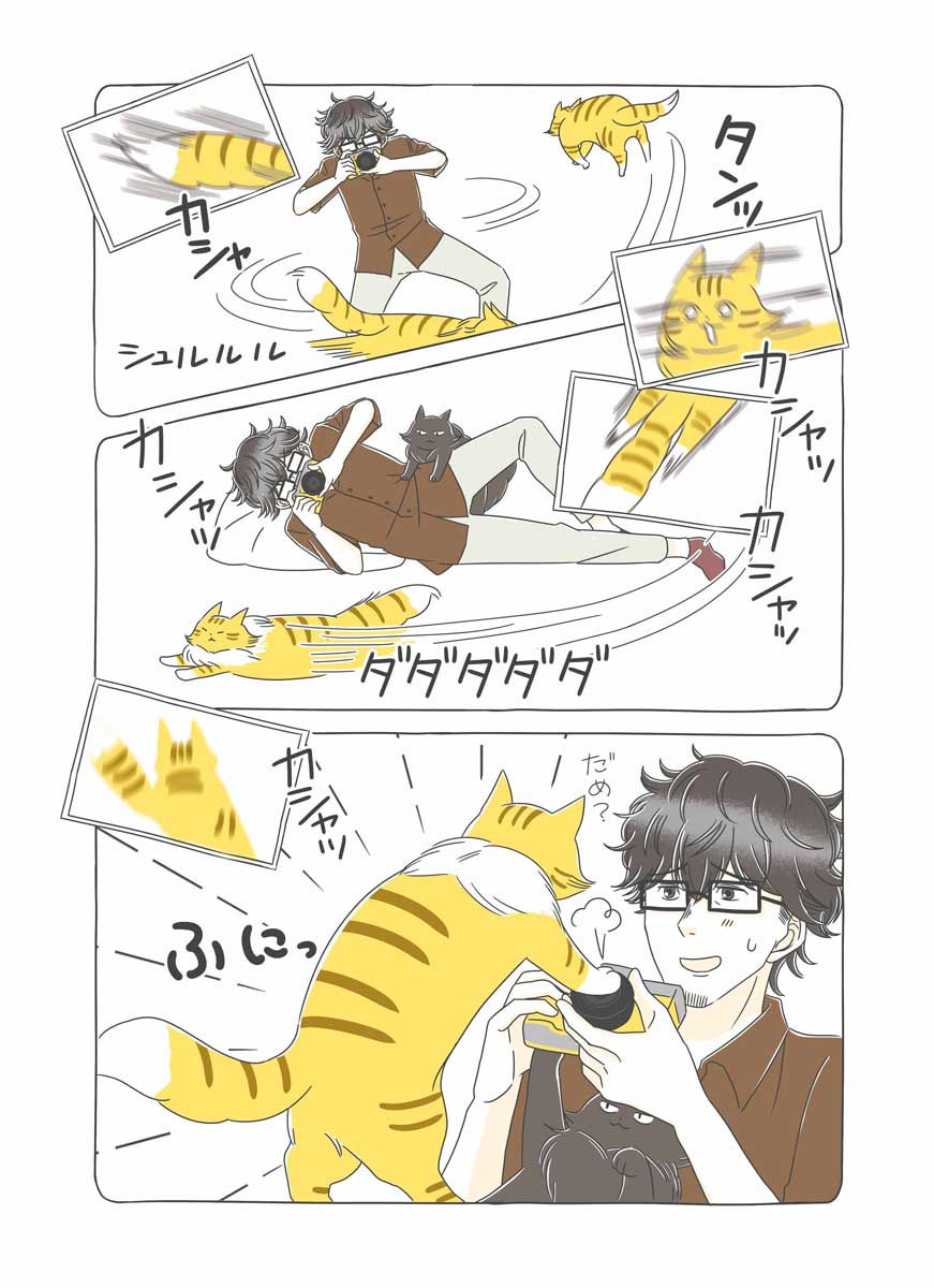 夏休みに山口くんの家に初めてやってきた浅田くん。目的はくろすけとちゃたろうの写真を撮ること。くせ毛の浅田くんは、ちゃたろうに髪を引っ張られおもちゃにされる一幕も。そんなこんなで、何度もシャッターを切るが、素早い動きでやはりうまく写ってくれないようで…