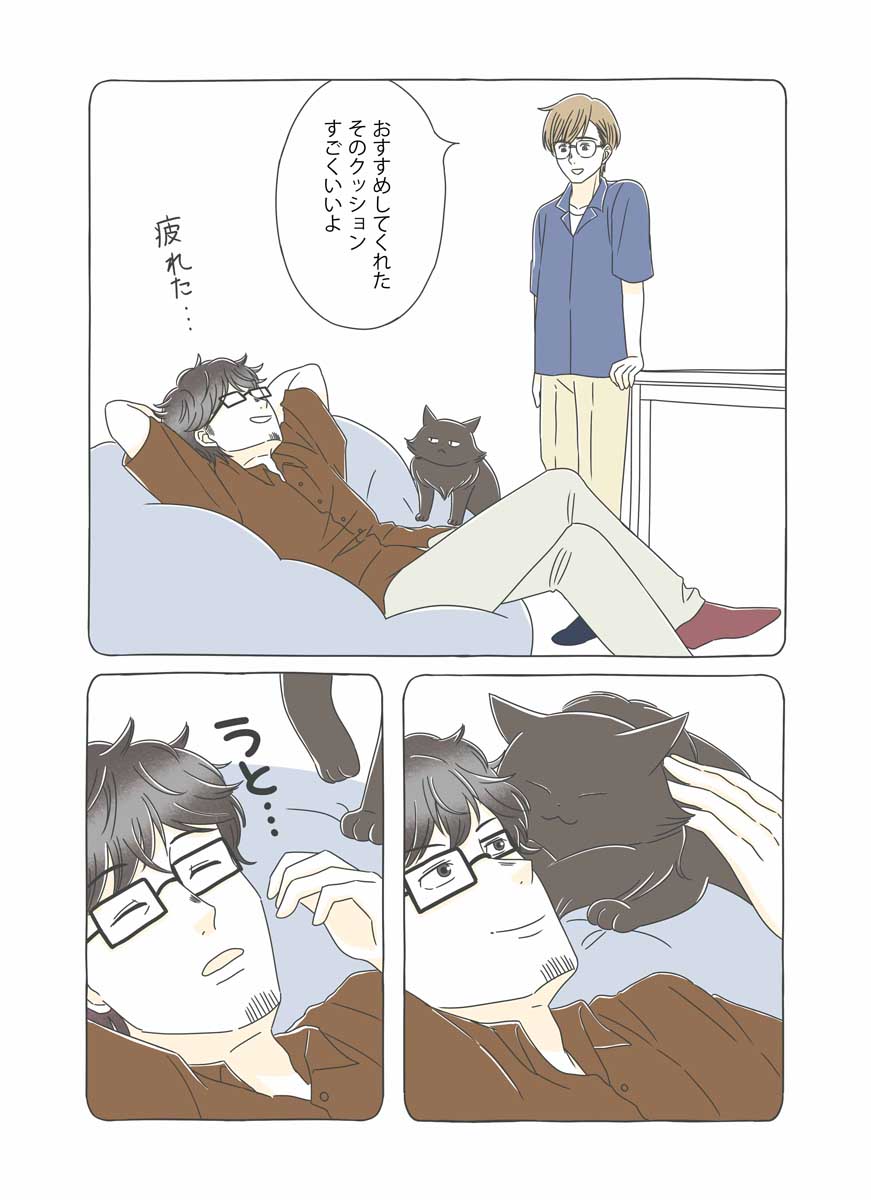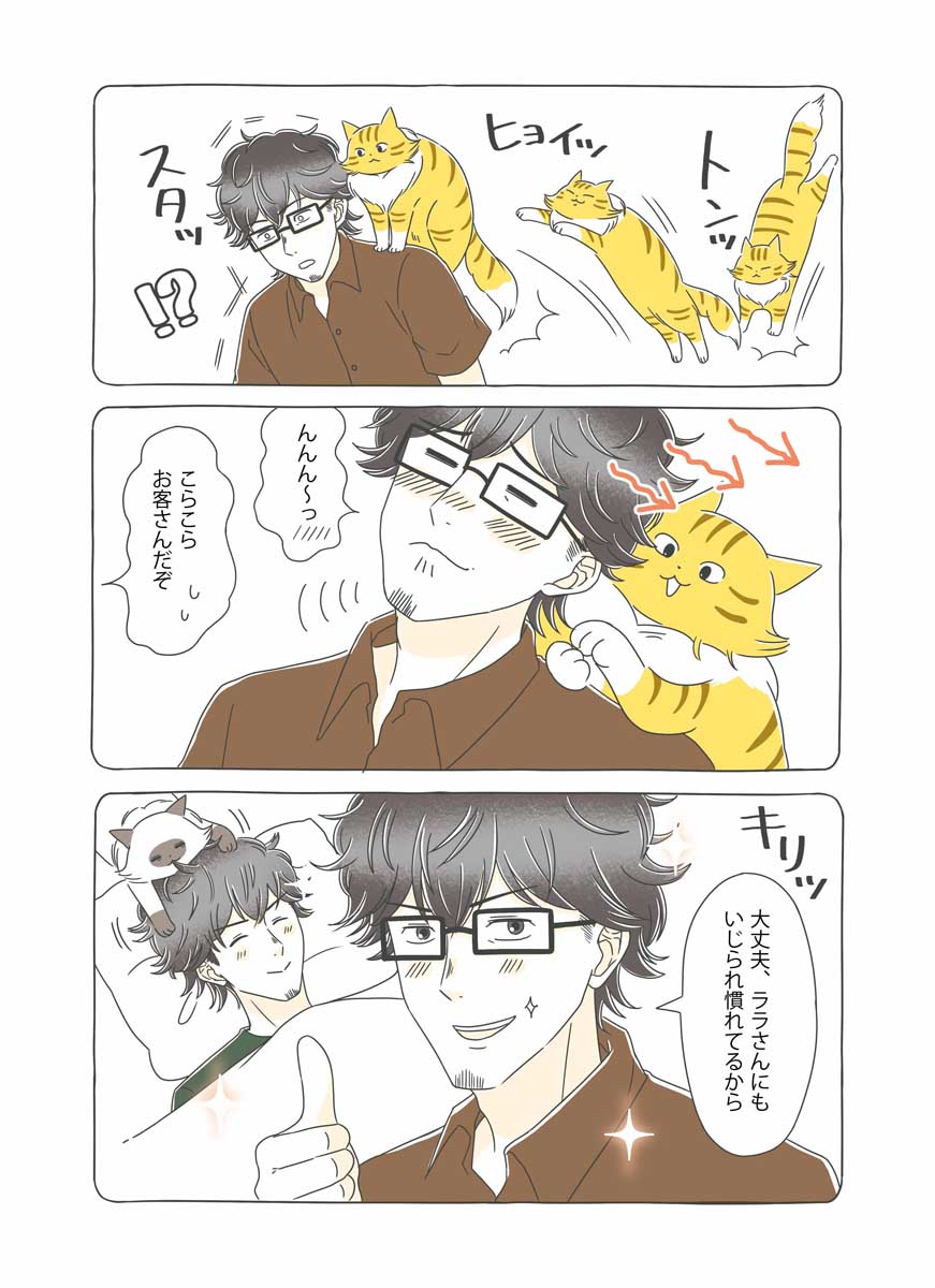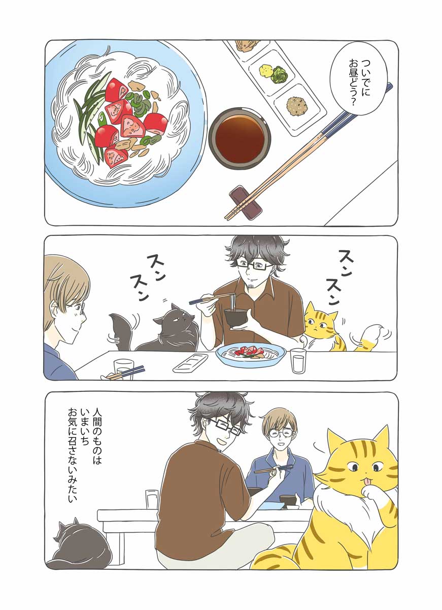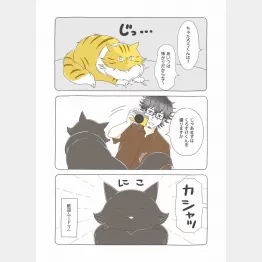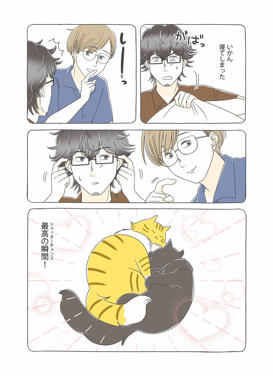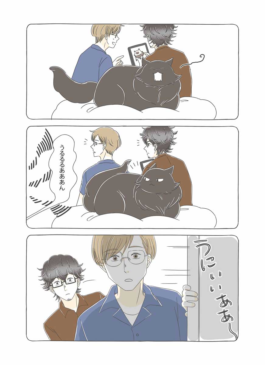 夏休みに山口くんの家に初めてやってきた浅田くん。目的はくろすけとちゃたろうの写真を撮ること。くせ毛の浅田くんは、ちゃたろうに髪を引っ張られおもちゃにされる一幕も。そんなこんなで、何度もシャッターを切るが、素早い動きでやはりうまく写ってくれないようで…