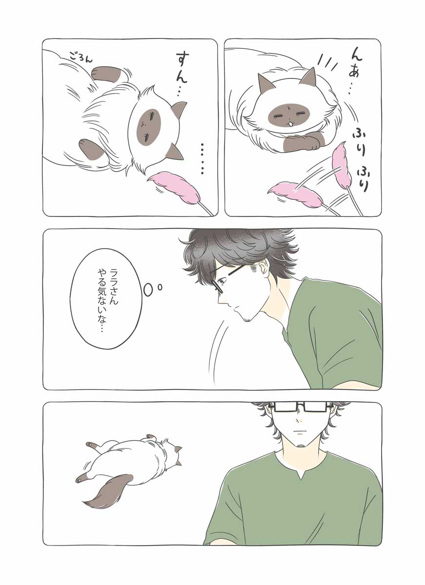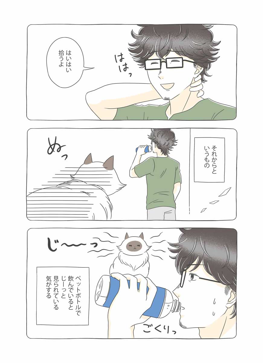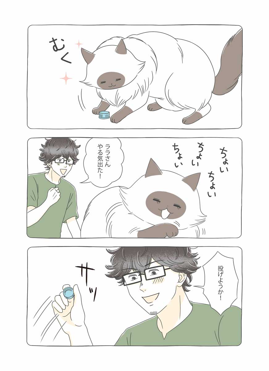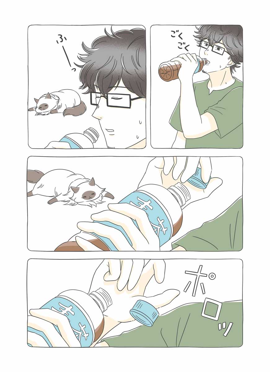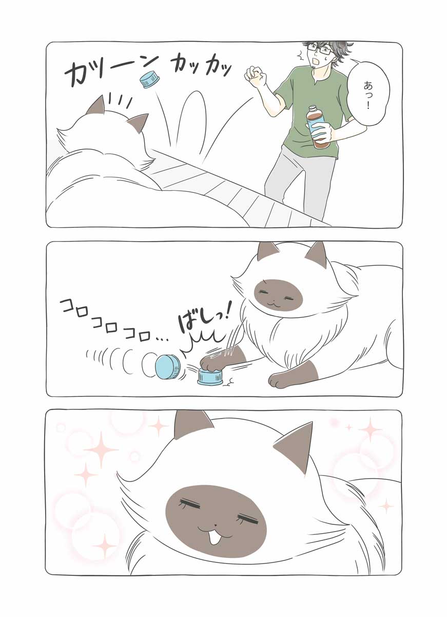 暑い夏の日、ごくごくと麦茶のペットボトルを飲み干す浅田くん。手を滑らせ、床に落としたペットボトルのキャップはララさんのおもちゃになってしまい…ララさんも楽しそう。