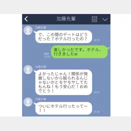 すると、「よかったじゃん!」の直後に別の人に送るような文面で「ついにホテル行ったって!」との誤送信が。