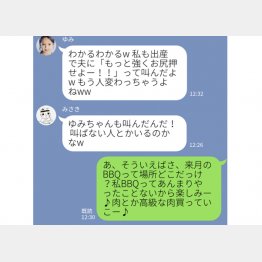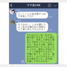 会話を止めてしまう人の中でも、特に嫌われやすいのが自分の話にすり替えてしまう人です。こちらのグループLINEでは、旦那の浮気の話題で盛り上がっています。一人の友達が「やっぱり旦那は浮気してたの?」と聞くと、張本人も「そうなの。しかも聞いて! 私が仕事の日に家に連れ込んでたんだよ」とショッキングな報告まで…。