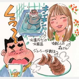 館内着を着て、1階ラウンジへ。サ飯にピッタリのディナーメニューからハイボール290円と餃子定食600円をオーダー。キリッと冷えた琥珀色のシュワシュワが体に染みるぜぃ。クゥ~。衣がパリッとした焼き餃子はニラがたっぷりで、ジューシーなうまみがたまりませんねぇ。うんうんとうなずきながらペロリと完食っス。