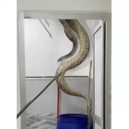 隊員らは長いつっかい棒などを使って天井を突くと、ヘビは抵抗しながらも徐々に姿を現した。まず太い尾の部分が天井を突き破り、浴室の床近くまでぶら下がる様子がカメラに収められている(写真=APMのTikTokから)。約30秒後にドスンという重い音とともに、ヘビが浴室の床に落下した。捕獲されたのは体重約60キロ、体長約5メートルのアミメニシキヘビ。捕獲後、生息地にリリースされたそうだ。