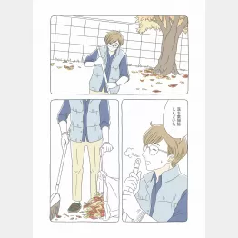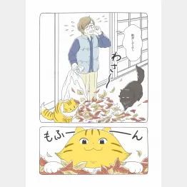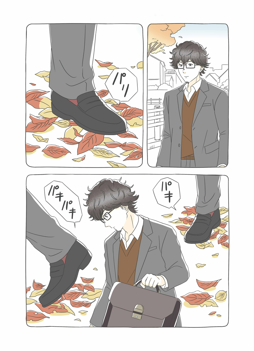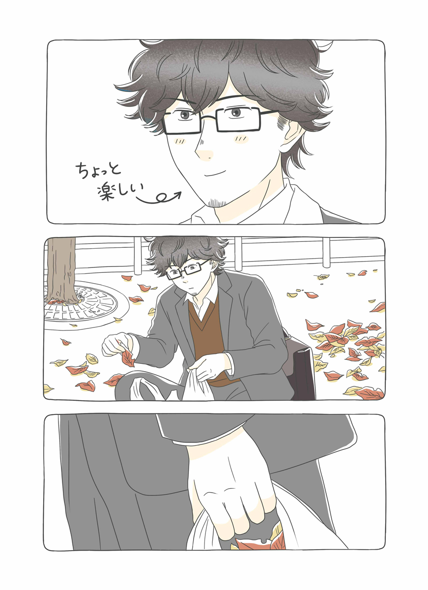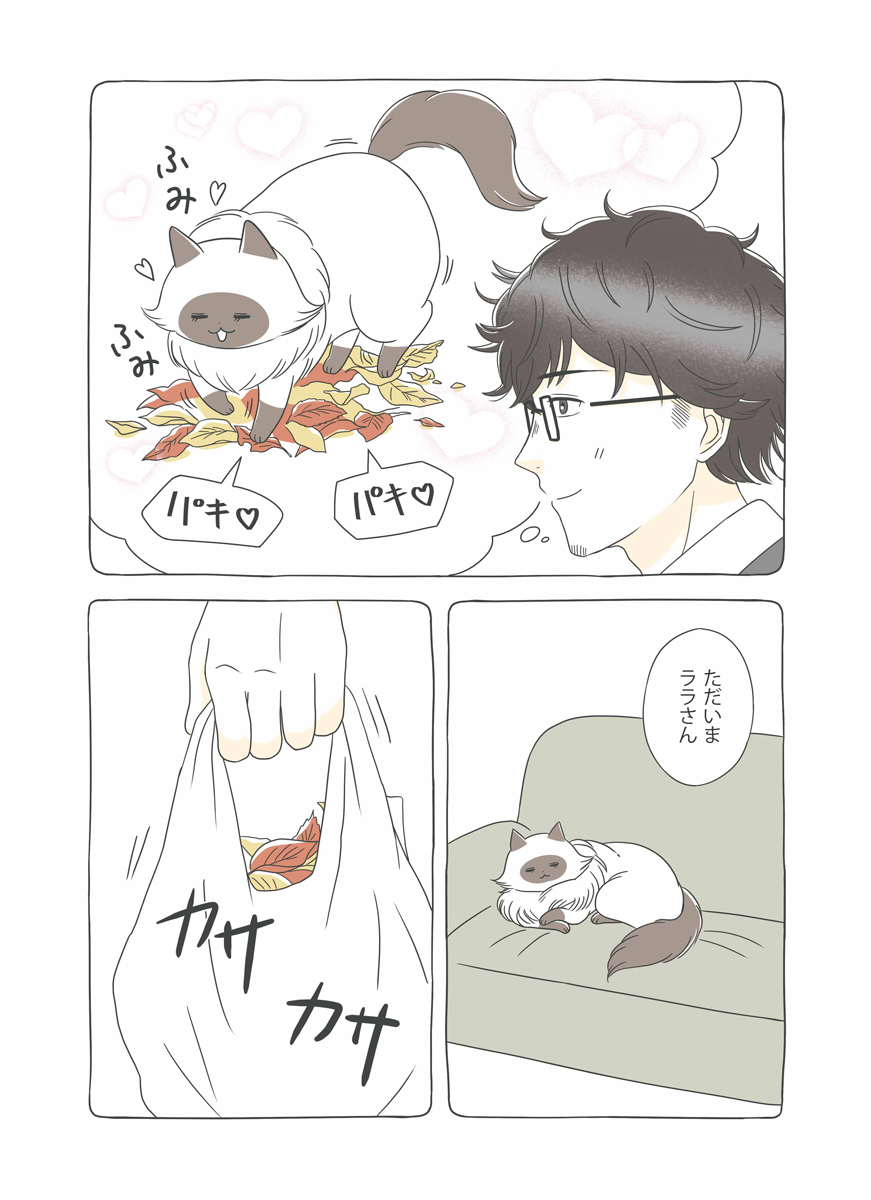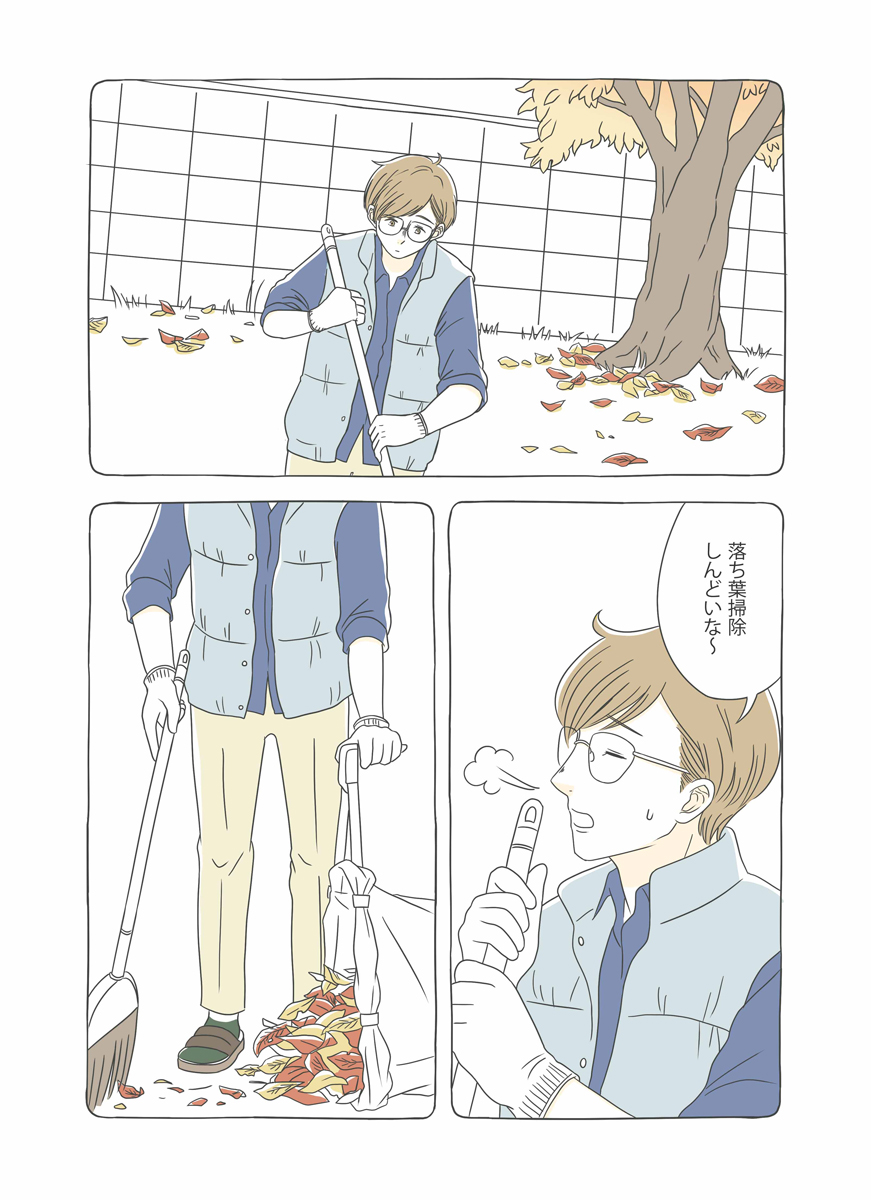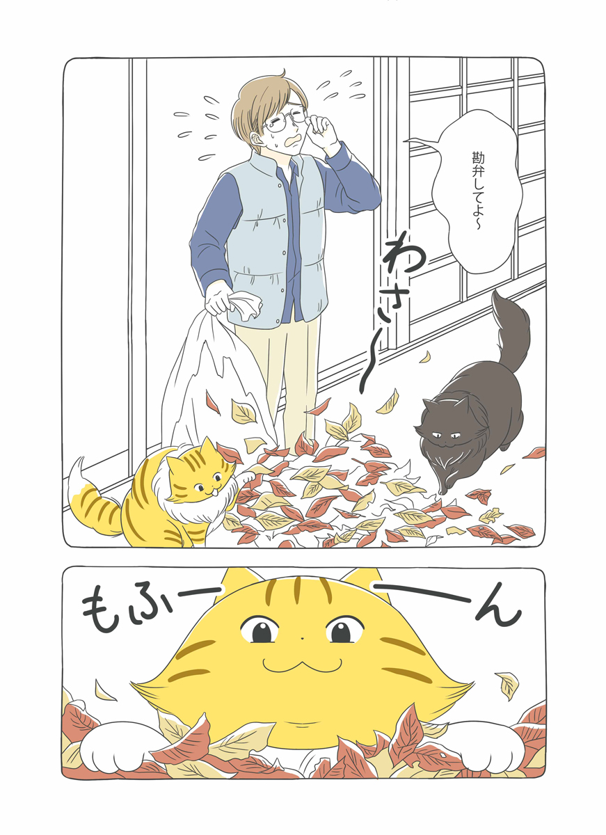 編集の仕事の帰り道、落ち葉を踏みしめると音を立てるのが楽しく、家に少し落ち葉を持ち帰るあさだくん。ララさんのリアクションはいまいち。一方、家の庭の落ち葉掃除が大変なやまぐちくんに猫たちは…。