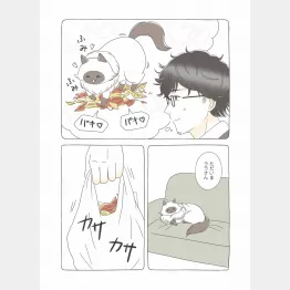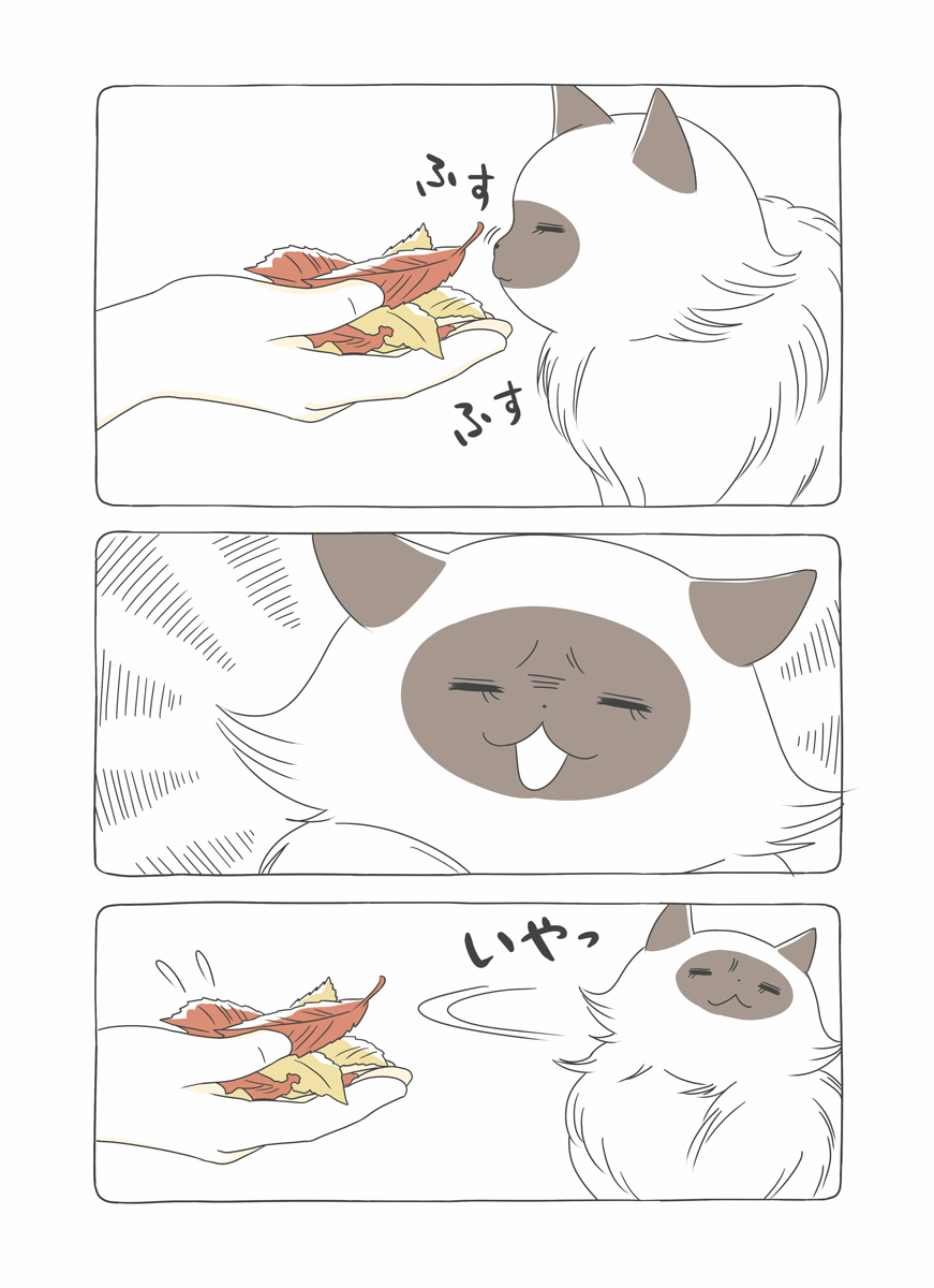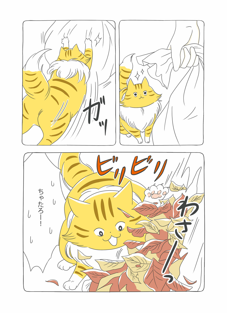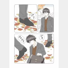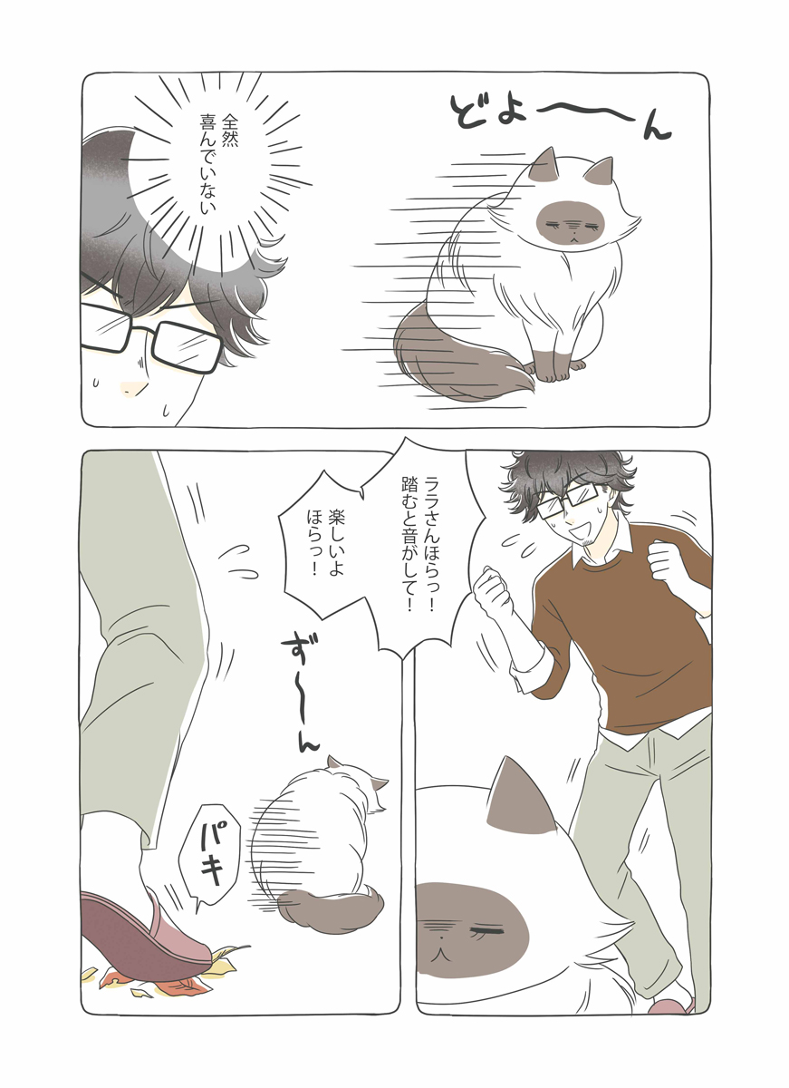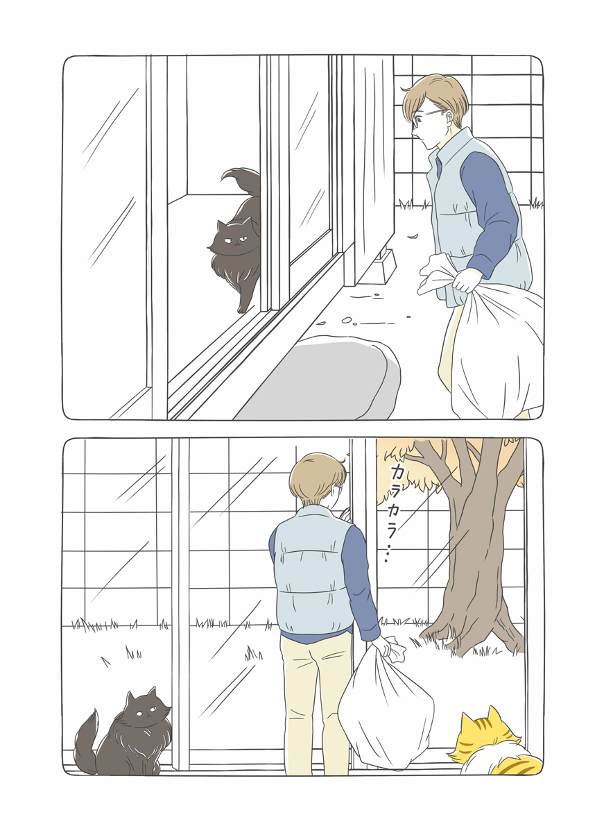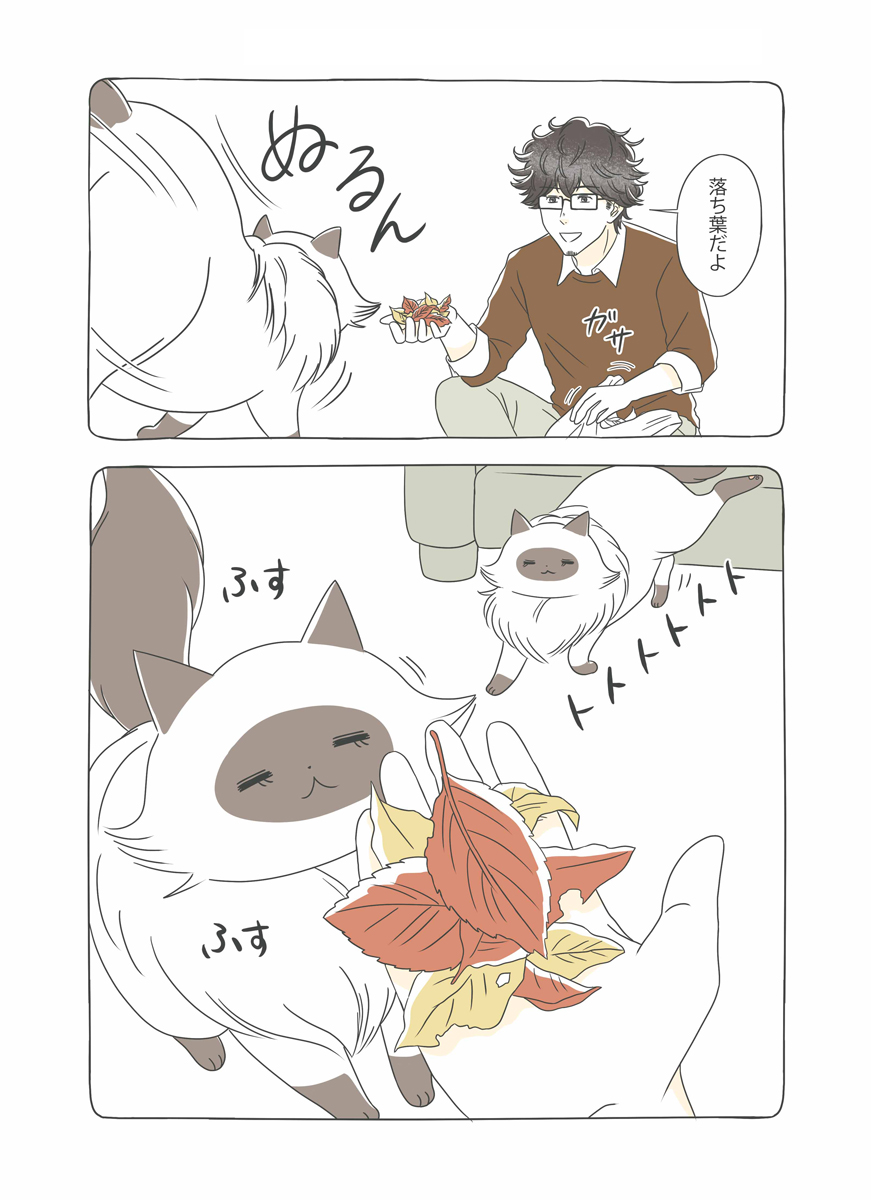 編集の仕事の帰り道、落ち葉を踏みしめると音を立てるのが楽しく、家に少し落ち葉を持ち帰るあさだくん。ララさんのリアクションはいまいち。一方、家の庭の落ち葉掃除が大変なやまぐちくんに猫たちは…。