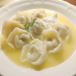 目の前にはずらりとウオッカのボトルが並ぶ。まずはポピュラーなストリチナヤ(530円)をショットで。そして何はなくともペリメニ(1340円=写真)と焼いたピロシキ(380円)。ペリメニはミンチ肉を小麦粉の皮で包んでボイルした逸品。たっぷりのバターソースとサワークリームで食べる。一つ口に入れるとモッチリした皮からミンチがあふれ、コクのあるバターとさわやかなサワークリームが混然一体となり、そのうまいことといったらアナタ!
