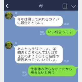 帰省時期もこんなLINE。あえて『いい報告って?』ってとぼけたんですけど、『あんたもう37でしょ』『そろそろ結婚の報告あってもいいでしょ』ってガチモードの返信がくるんですよね。