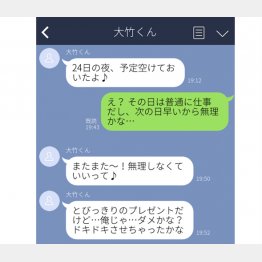 「これは、数回食事に行っただけの勘違い男からのLINEです。まだ付き合ってもいないのに、なぜか彼氏ヅラで上から目線の内容にびっくり。頼んでいないのに、24日を空けておかれても…。