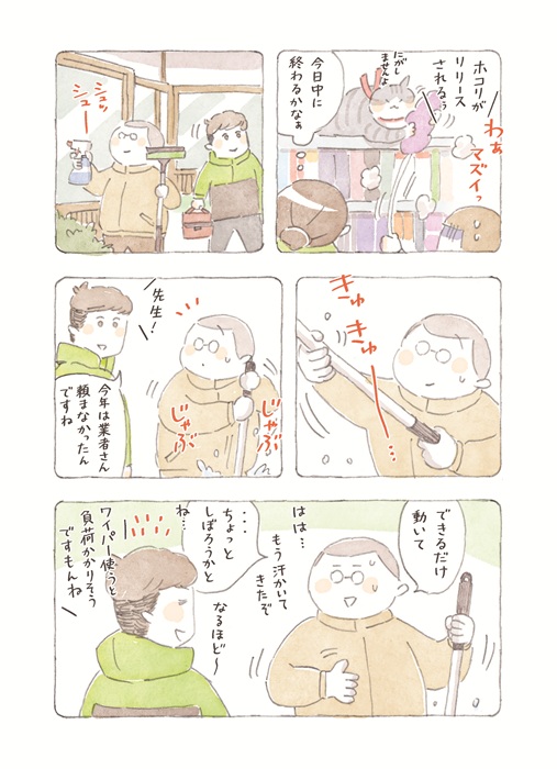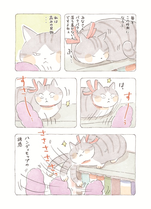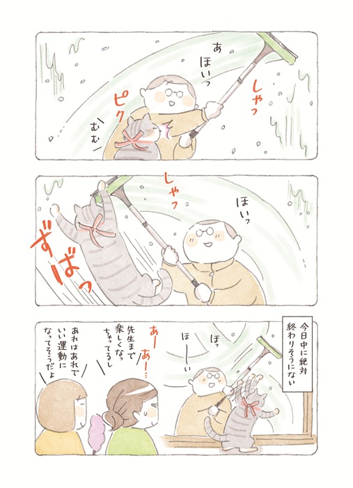 【動物&飼い主ほっこり漫画】しっぽのお医者さん~ねこ医院長のぽかぽか日記 第109回「院内大掃除! ワイパーを狙う名ハンター」