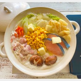 寄せ鍋つゆの素に牛乳とバターを加えてコクをプラス、コーンの甘味がおいしい「ミルクバター鍋」は、「牛乳とバターでマイルドなコクでうま味アップです」という。