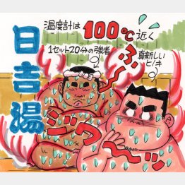 ジワ~ッと包まれる輻射熱が実にエエ気持ちやぁ。銭湯にしてはやや広めの室内で、体に負担のないマイルドな熱波もエエわぁ。鼻の奥のチリチリ感を楽しんでいると、2分ほどで玉汗がタラ~リ。ふと、天井近くの温度計に目をやると、100度近いぞ。