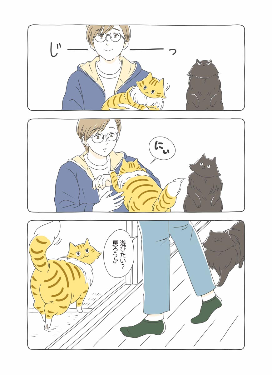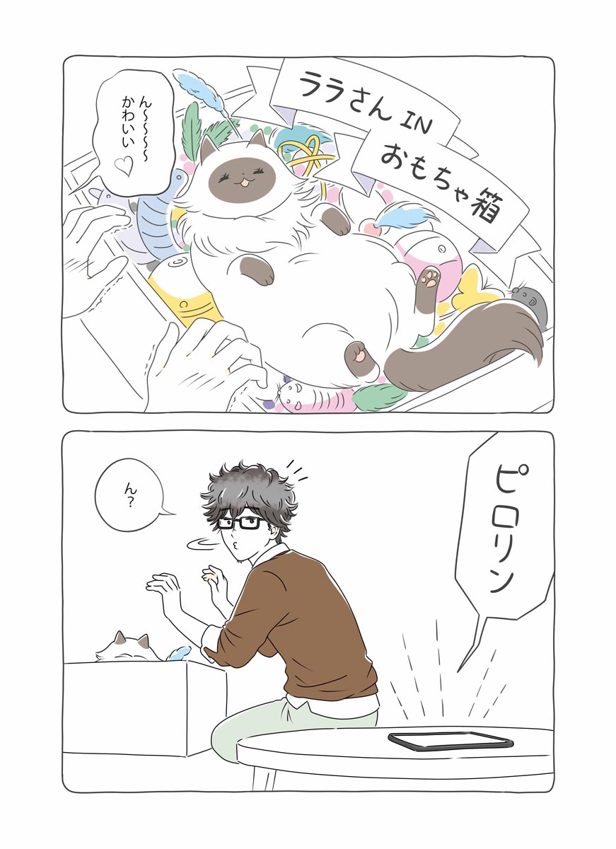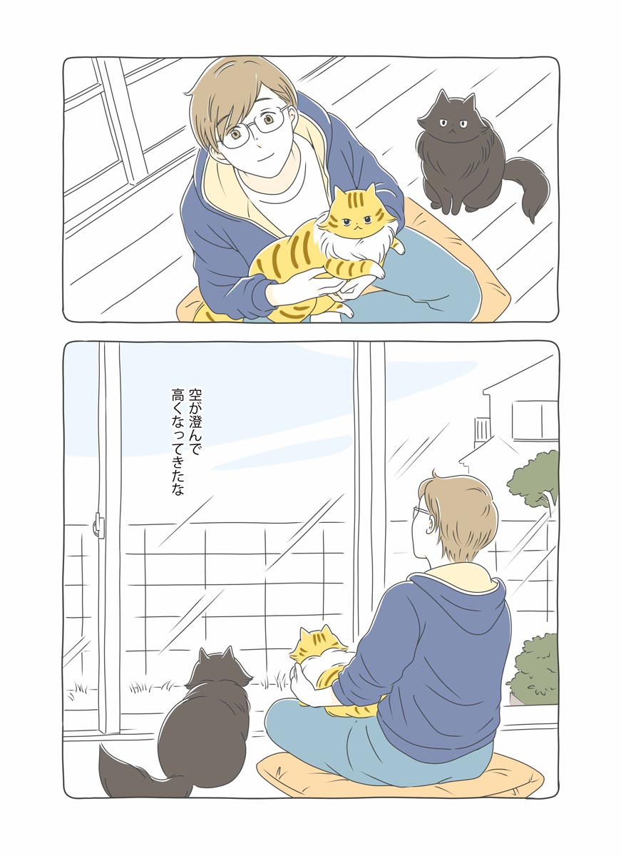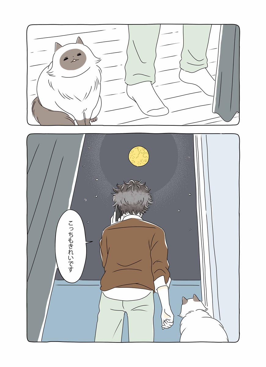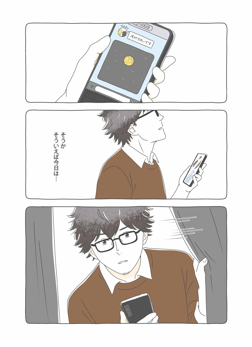 秋になり、高くなってきた青空を思わず見上げる山口くん。日も暮れて…くろすけに教えられ、満月の写真をチャットにあげた山口君くんに、「こっちもきれいです」と返事をした浅田君。スマホを手に月を見上げる横でララさんも空を見上げている。