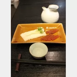 メニューを見ていて、アッと声が出そうになったのは、カラスミがあったからだ。寒い季節、あん肝、白子などの文字を見ると、そわそわして、落ち着かなくなる。とても素通りはできない、と思ってしまう。