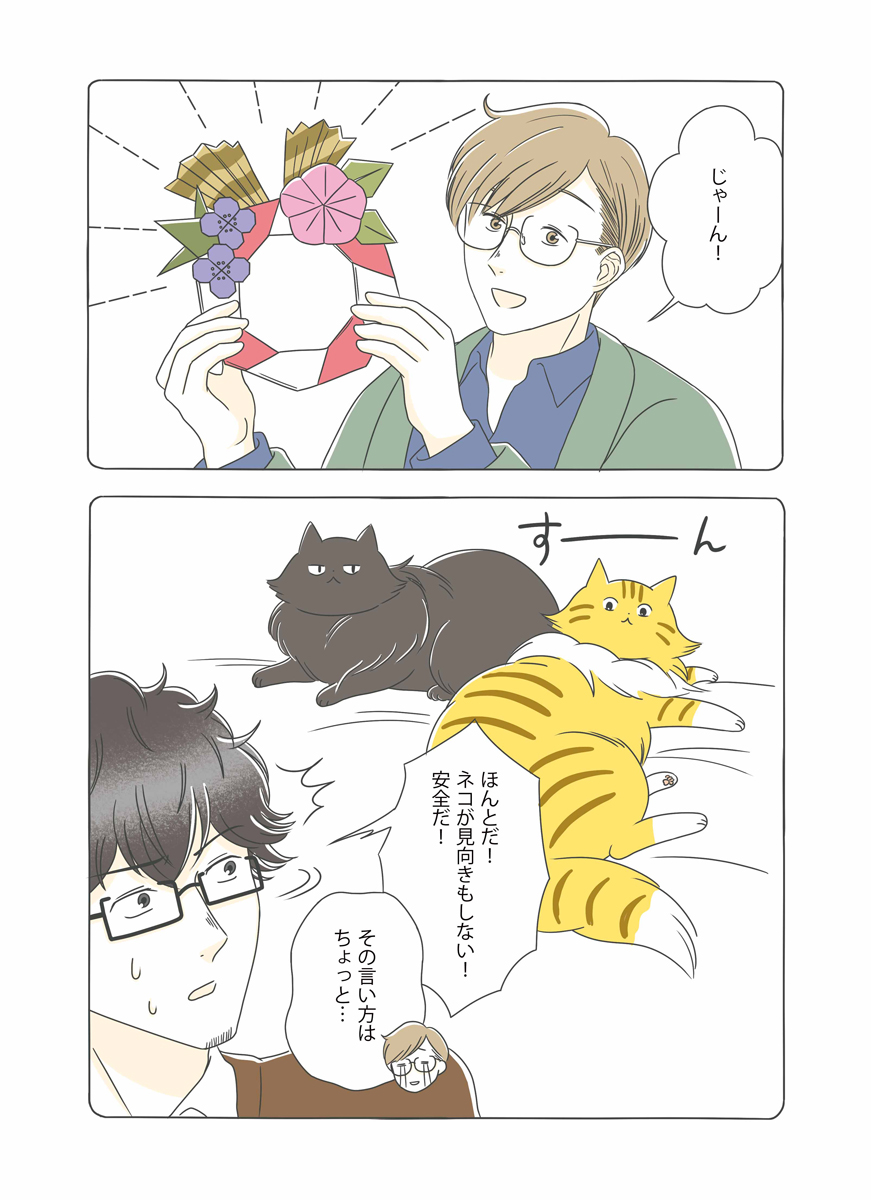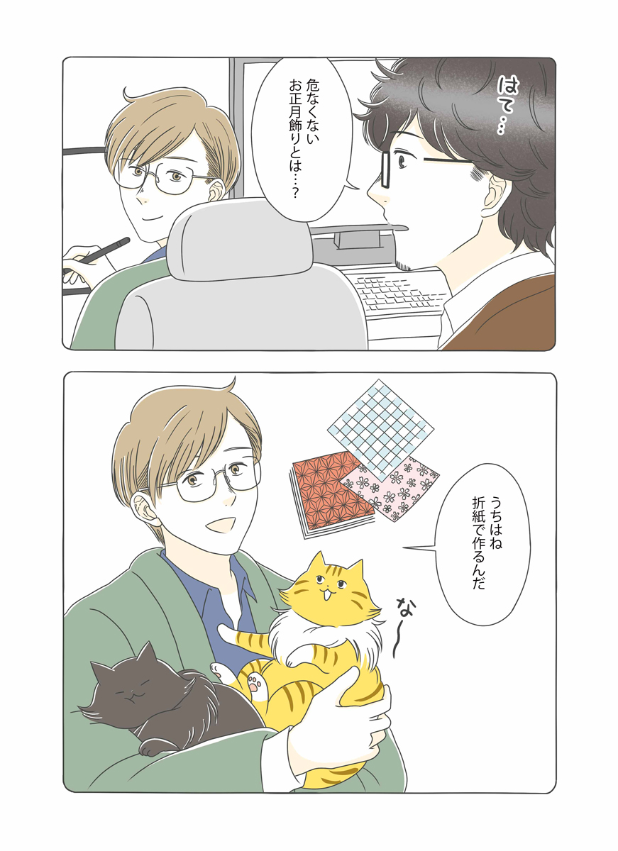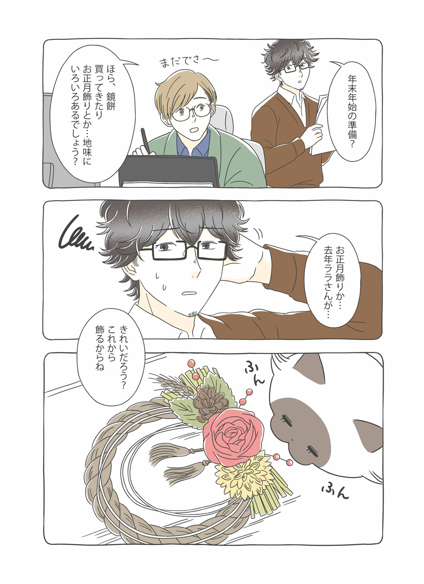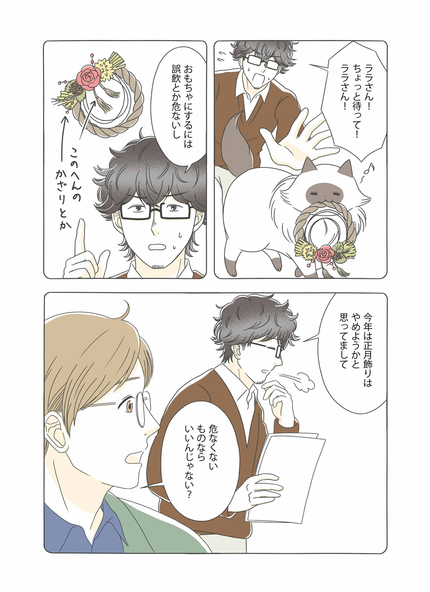 そろそろ年末年始の準備。しめ縄の話になり、去年ララさんが食べそうになったから危なくないもので作ろうと話す、あさだくんとやまぐちくんだが…