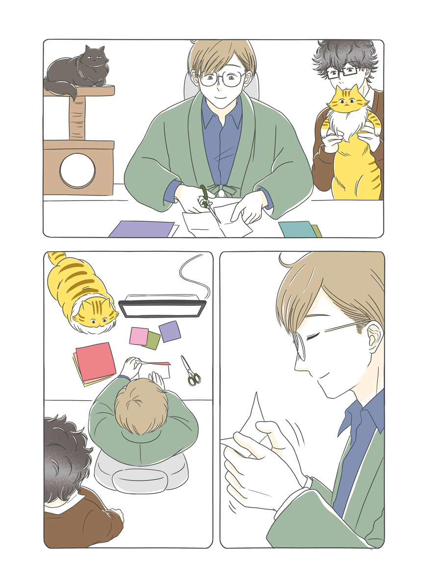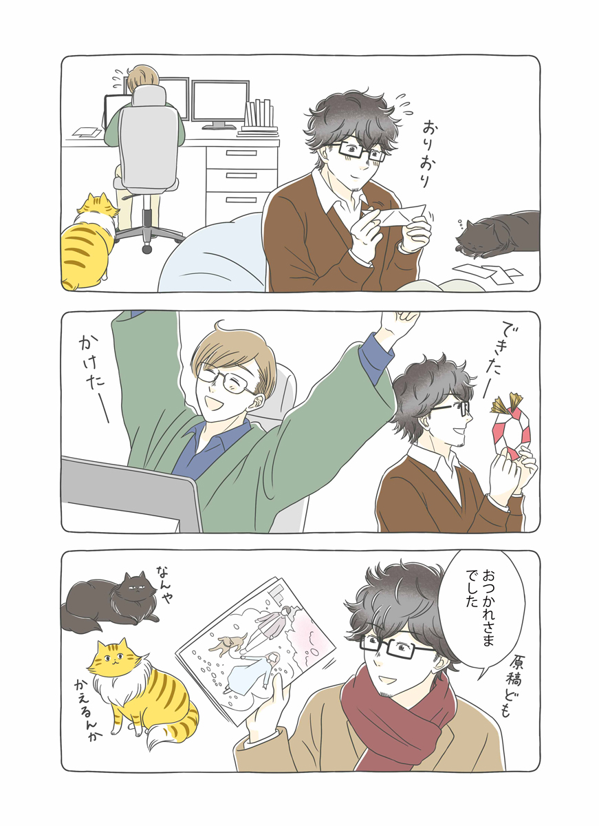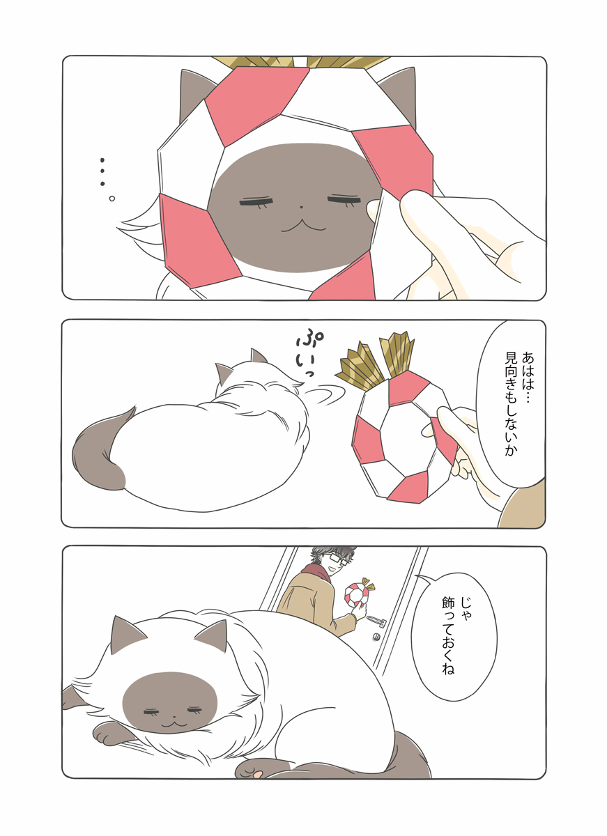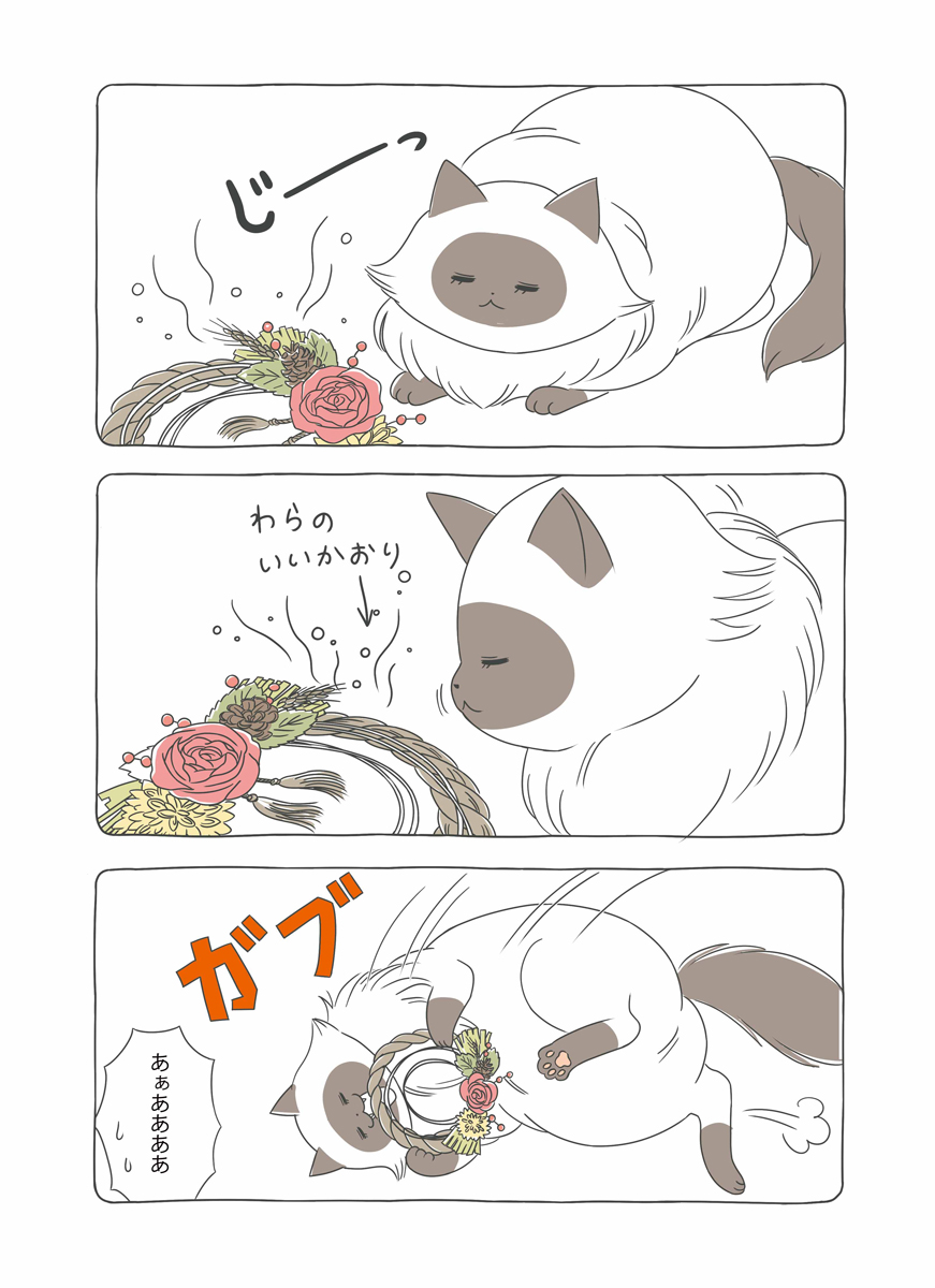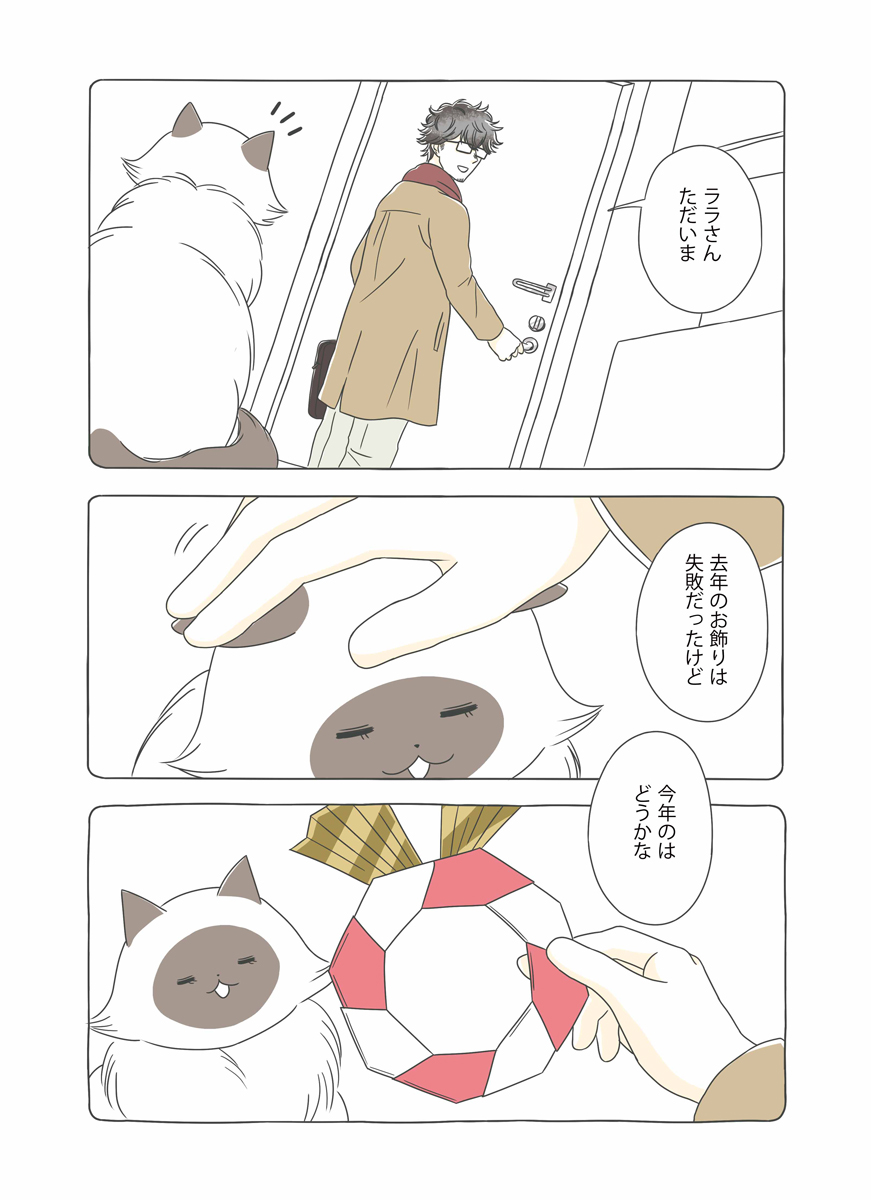 そろそろ年末年始の準備。しめ縄の話になり、去年ララさんが食べそうになったから危なくないもので作ろうと話す、あさだくんとやまぐちくんだが…