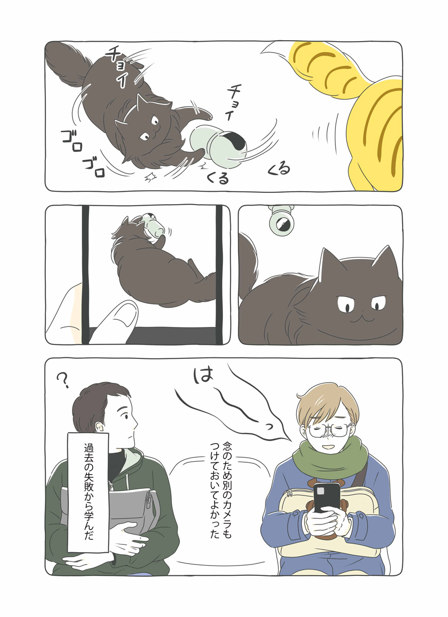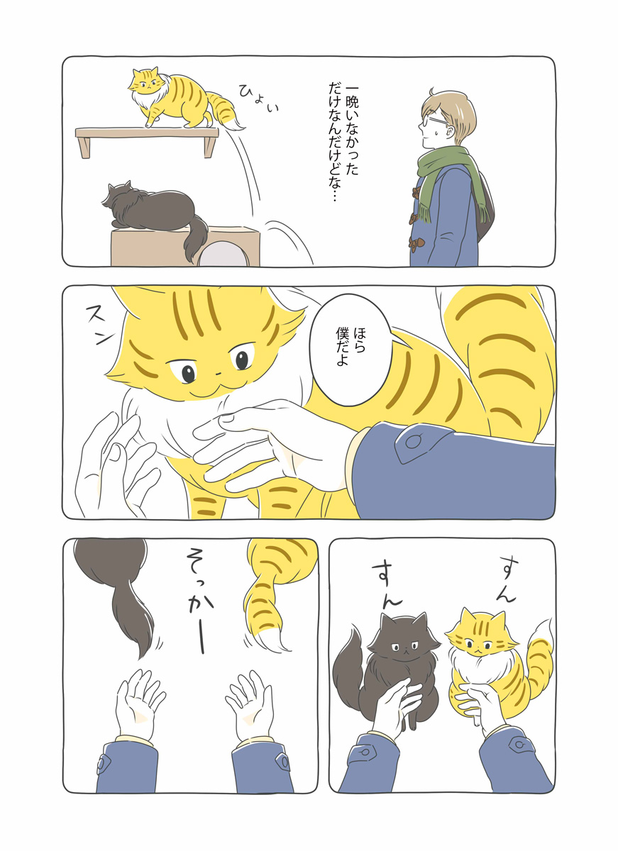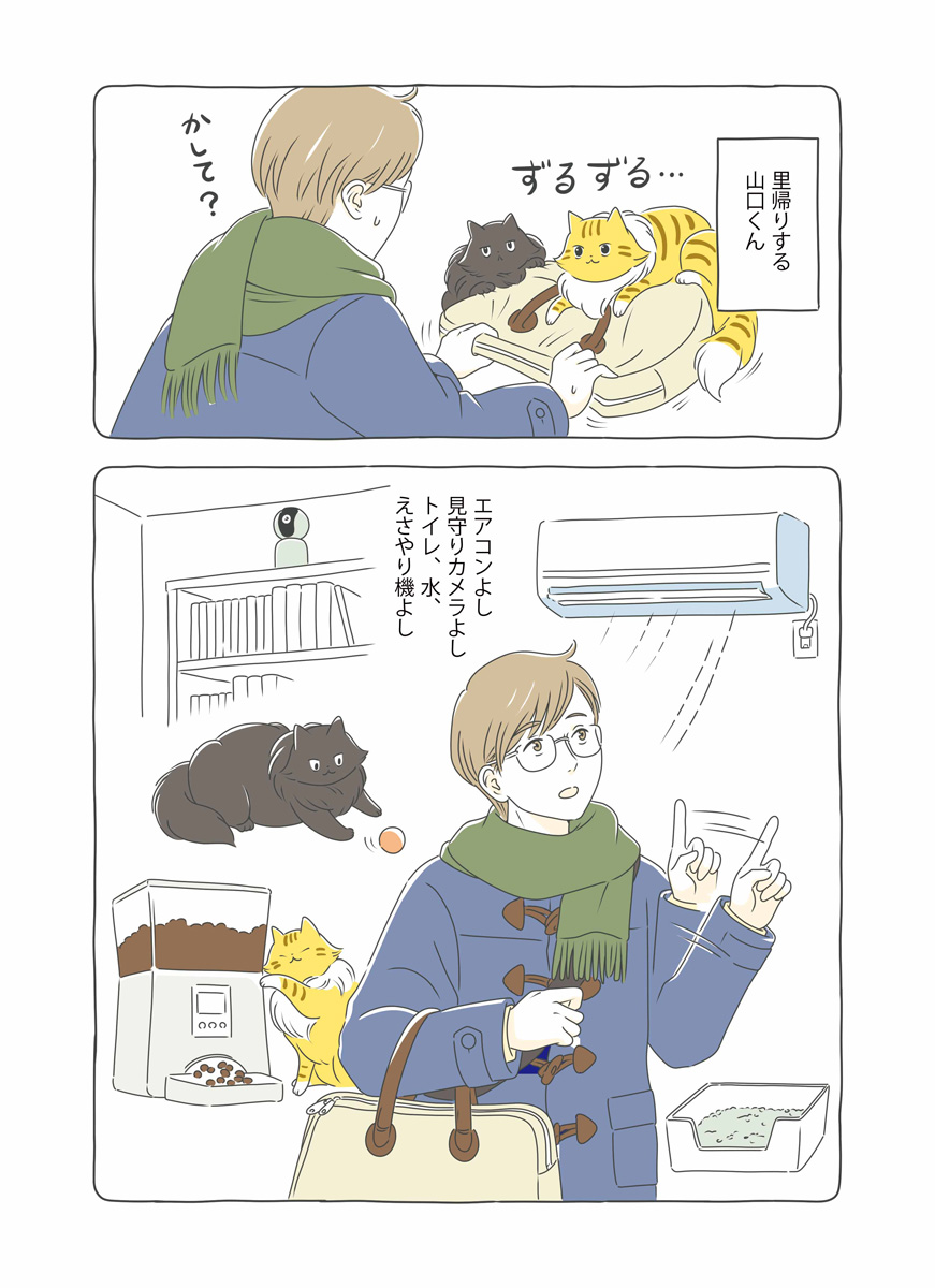 年末年始、実家に帰省する山口くん。2匹に留守番を頼んで出発。ちゃたろうはさっそく見守りカメラを倒したりとやりたい放題。帰宅後、飼い主を忘れかけるちゃたろうとくろすけ。匂いをすんすんと嗅ぎ続けて数時間後ようやく飼い主を思い出す。