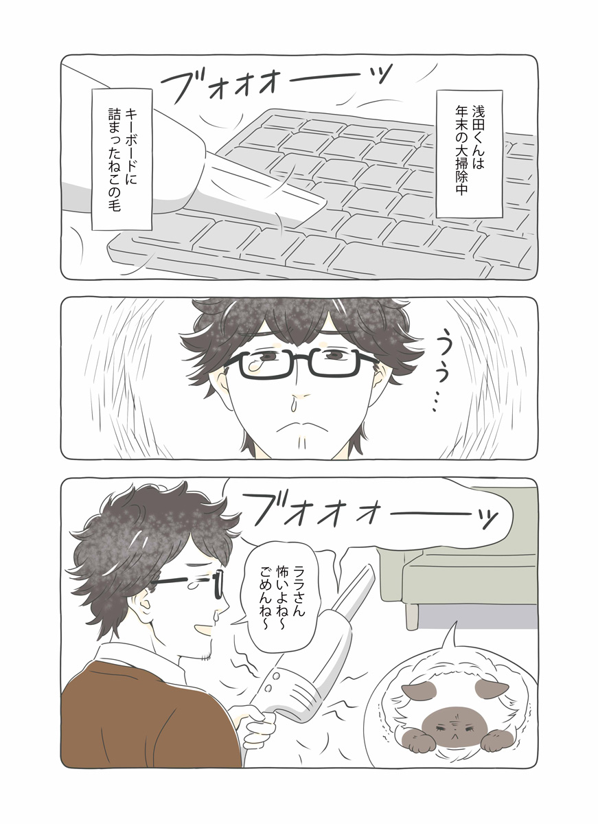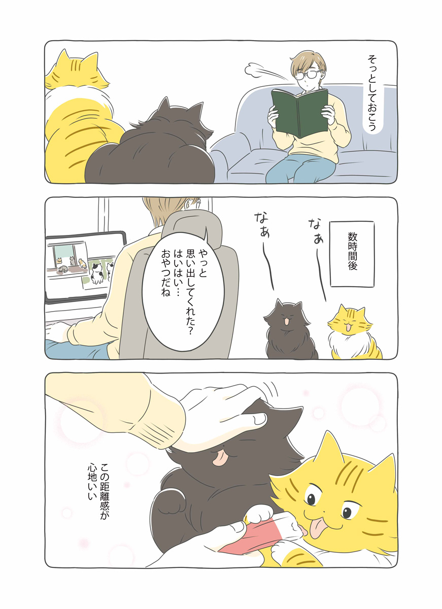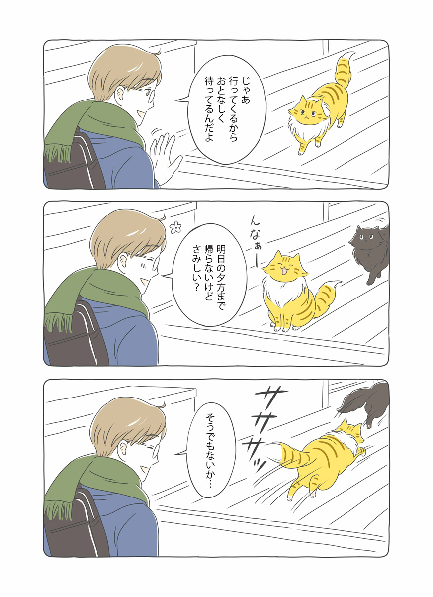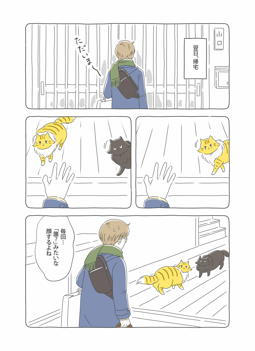 年末年始、実家に帰省する山口くん。2匹に留守番を頼んで出発。ちゃたろうはさっそく見守りカメラを倒したりとやりたい放題。帰宅後、飼い主を忘れかけるちゃたろうとくろすけ。匂いをすんすんと嗅ぎ続けて数時間後ようやく飼い主を思い出す。