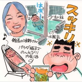 のんびり4セット満喫すると、手脚はクッキリあまみ大島状態。ニマニマしながら、浴場の階段で2階へ上がると、お、正面ののれんの奥に個室サウナ(利用時間午前10時~午後11時で予約制。料金別)がありました。ととのいスペースの柵には木彫りの風流画が施され、隅々まで趣深いっスねぇ。木製ベンチをスルーして、名物のパラダ椅子で天国気分でととのいました。