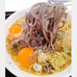 ナント、ここの責任者である栗本さんはアタシが昔よく飲みに行った銀座の店のマスターだったのである。その風貌からタコちゃんという愛称で呼ばれていた。タコちゃんに引っ張られ、コの字カウンターの正面に案内された。目の前には巨大なおでん鍋。奥の黒板には今日の肴がズラリ。それがすべて220円! 飲む客にはまず突き出し3種(550円)が出される。先客10組はビール大瓶が275円! アタシはこの日の1組目。肴は鮪と鯵(各220円)。店内の7割ほどの客は蕎麦だけの女性たちながら、すでに焼酎お湯割りで上機嫌のお父さんも。若いカップルが珍しそうにおでん鍋をのぞいている。サービス精神の権化のようなタコちゃんに引きずられ、カウンター内のお姐さんたちも元気溌剌。こっちも勢いでお酒を頼んでしまう。ライブ感満載である。