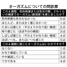 オーガズムについては近藤医師らが作成した問診票をもとに採点。〈別表〉の通りで最高は9点、最低は1点だ。そのスコアが記録された日に近い時点の精液所見との関連を調べている。