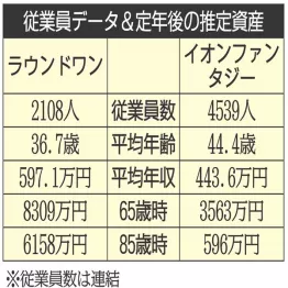 両社の社員がこの収入に応じた平均的な支出を続けた場合、65歳時の推定資産(貯蓄可能額)はラウンドワン8309万円、イオンファンタジー3563万円です。85歳時は6158万円と596万円。どちらも安定した老後が待っていそうです。