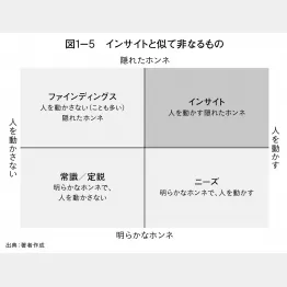 似て非なるものとして、ここでは「ニーズ」「ファインディングス」「常識/定説」の3つを取り上げます。それぞれの違いをわかりやすく捉えるために、先ほどのインサイトの条件であった「人を動かす」と「隠れたホンネ」の有無の2軸で4象限に分けて考えてみます(図1−5)。