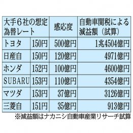 問題は自動車大手6社の想定為替レートだ。2025年3月期の設定(第4四半期)は、1ドル=150~153円の水準だった〈別表〉。為替変動の業績への影響度を示す「感応度」を見ると、1円円高が進めばトヨタの営業利益を年間で500億円ほど押し下げる効果があるという。日産は120億円、ホンダは100億円、SUBARUは110億円とそれぞれ減益が生じる見込み。