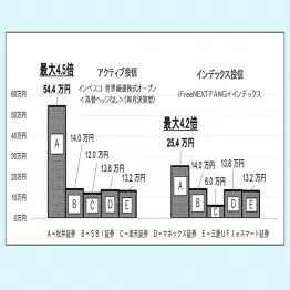 年会費無料カードで月10万円を10年間積み立てた場合、アクティブ投信では松井証券が最大4.5倍、インデックス投信でも同社が最大4.2倍と最も高いポイント還元率となる(アクティブ投信は「インベスコ 世界厳選株式オープン<為替ヘッジなし>(毎月決算型)」、インデックス投信は「iFreeNEXT FANG+インデックス」で算出、別図参照)。