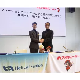 愛知県内に50店の食料品などのスーパーマーケットを展開する「アオキスーパー」(本社名古屋市・青木俊道代表)が、核融合エネルギーの実用化を目指す「ヘリカルフュージョン」(本社東京・田口昂哉CEO)と、核融合エネルギーによる電力売買契約を締結した。