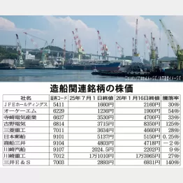 造船業に追い風が吹く中、株式市場では昨年半ば以降、関連銘柄が軒並み高騰。そこで、この記事で紹介する10社の株価を抜粋。昨年7月1日の終値と今年1月16日の終値をそれぞれ比較したのが〈表〉だ。日本郵船と商船三井がほぼ横ばいだった以外、残りの8社はすべてプラス。中でも航海用機器を手掛ける古野電気と船舶エンジンや港湾クレーンなどを扱う三井E&Sは2.5倍近くにハネ上がった。「国策銘柄に売りなし」といわれるように上昇トレンドに入っている。