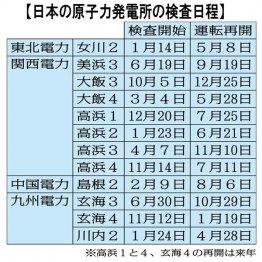 今年の検査日程は〈別表〉の通り。各電力会社が原子力規制庁に提出した今年度の「発電用原子炉の運転計画」を基に作成した。トラブル続きで今月18日に営業運転を再開予定の東電・柏崎刈羽6号機を含めた15基のうち、実に12基が年内に検査入りするのだ。