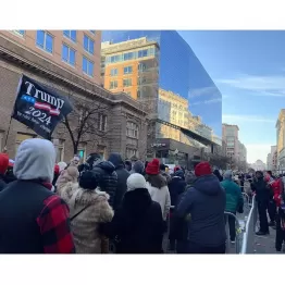 それに伴い、議会前のナショナルモールの巨大な観客席も、近くのキャピタル・ワン・アリーナに振り替えられた。そのため、数十万人と予測された観客がキャパ2万人のアリーナに殺到したのだ。朝8時の開場時、真っ赤なMAGAハットをかぶり着膨れした人々の行列は、首都の中心部からチャイナタウンを突っ切って、はるか先まで伸びていた。就任宣誓が行われる正午までには、入場できなかった人々が街を徘徊し、テレビがあるスポーツバーやレストランに詰めかけた。