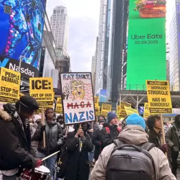 ニューヨークの中心タイムズスクエアで、不法移民の強制送還への抗議集会が開かれた。2月9日(日)のことだ。