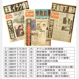 95年の「阪神大震災」と「オウム事件」以外でランクインしたのは、「戦争」が2つ、「選挙」が3つだった。