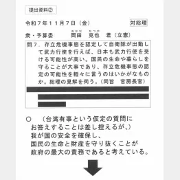 集団的自衛権を行使できる「存立危機事態」を巡り、台湾有事も該当し得るとした高市首相の国会答弁。やっぱりあれは、高市首相の暴走だった。事務方が用意した答弁原稿には記載されていなかったことが、立憲民主党の辻元清美参院議員が12日までに受け取った質問主意書に対する政府の回答で分かったのだ。