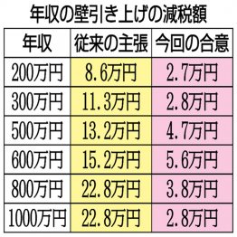 昨年の衆院選と今年の参院選で、国民民主は一律178万円への引き上げを主張。これまで訴えてきた年収別の減税額と、合意した減税額との比較は【別表】の通りだ。