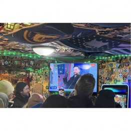 強風が吹き荒れ、体感温度は氷点下11度。それでも参加者は長い列をつくり、近隣のバーでは、多くがテレビ中継にクギ付け(写真)になった。