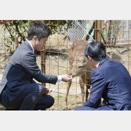 先月25日、大阪市内で捕獲された「迷いシカ」を保護している大阪府能勢町の温泉施設「能勢温泉」で3日、命名式が行われ、大阪府の吉村洋文と奈良県の山下真両知事が出席した。