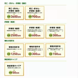 ではB型肝炎訴訟でもらえる給付金の金額はいくらか。それは肝がんや慢性肝炎などの病態によって以下の通り定められている(写真②)。最大で3600万円、最も少なくても50万円だ。また、B型肝炎ウイルスに感染しているなら、まだ肝炎を発症していなくても給付金をもらうことができる(いわゆる「無症候性キャリア」)。