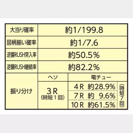 図柄大当りを引き当てさらにRUSH獲得、これをいかに継続させられるかが出玉のカギを握るという流れは、今ホールで最も人気の高いゲーム性だ。中でも同機は別表の通り、当りやすく継続しやすい理想のスペックだといえる。