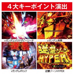 なおこのギミック演出のほか通常時の大チャンス演出が、リーチ後にνガンダムの3Dムービーが発生する「νガンダム背景」や「逆襲ゾーン(HYPER)」突入、オリジナル映像による「νガンダム vs サザビーリーチ」で、出現すれば大当りの期待は大いに高まる。
